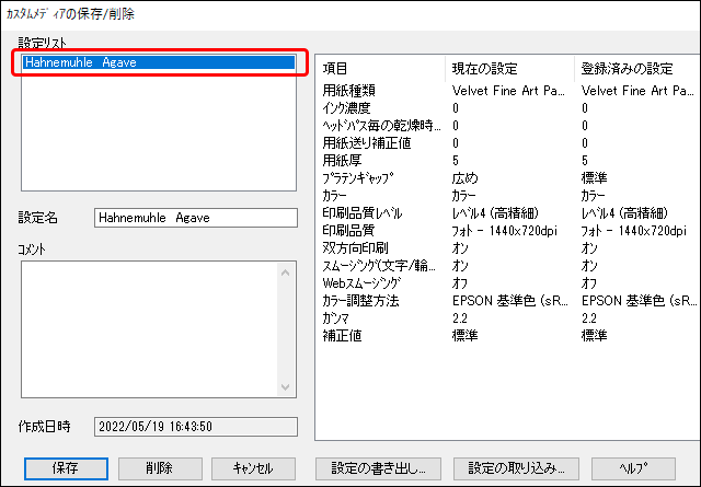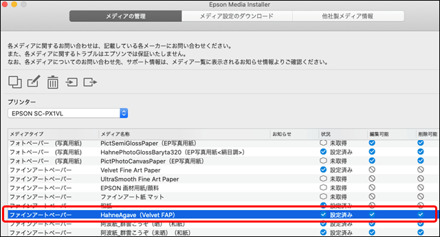 Velvet Fine Art Paperはエプソンの純正紙なので、エプソンのプリンターで用紙設定に「Velvet Fine Art Paper」が含まれている機種なら、「Velvet Fine Art Paper」を選んでプリンターで色管理をする設定で出力するとある程度の精度で正しく出力できます。